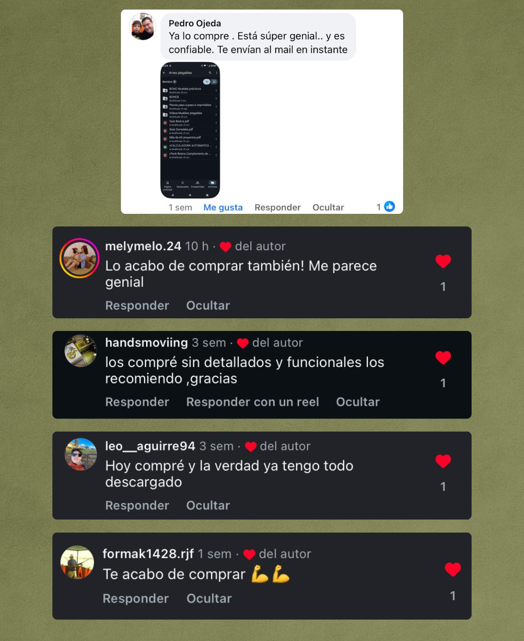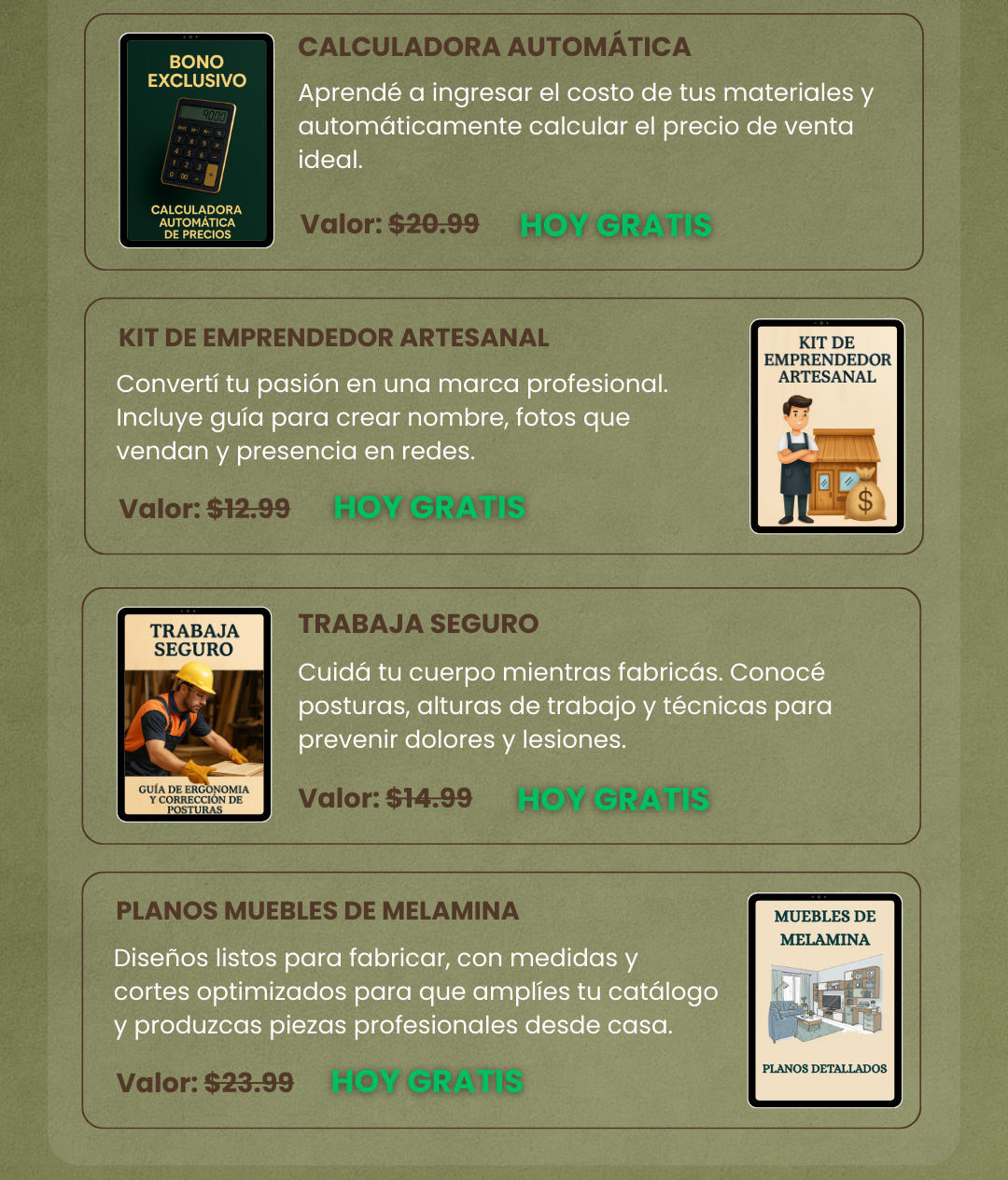 Recibís acceso inmediato a un archivo digital (PDF) con todos los planos y materiales, además de videos explicativos y la calculadora de precios.